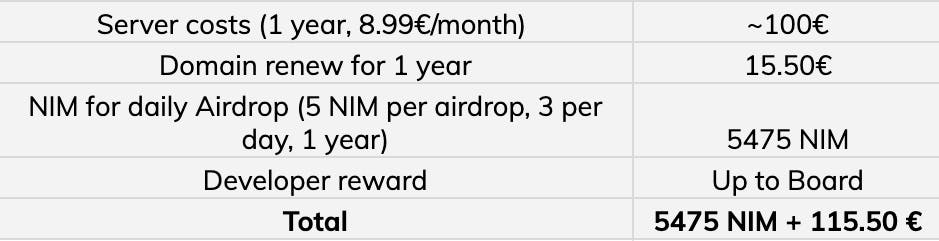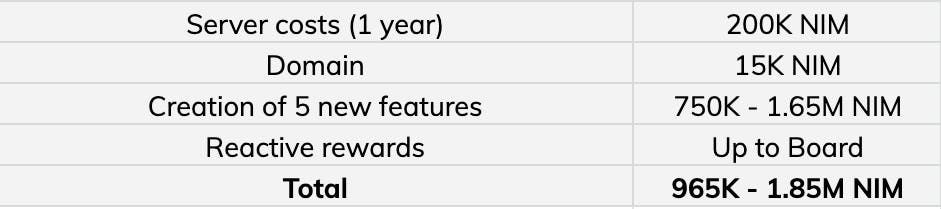 The Board commented on how the amount of NIM requested for airdrops seemed low and agreed to ask Albermonte if he wanted to increase the amount of airdrop NIM requested. It was agreed that server costs would be covered for two months until a Community Managed Server Infrastructure Service was set up to support projects like this. The Board also decided to allocate a reward of 500K to recognize the effort that goes into this project. This does not only include development but also the awesome support that Alberto provides in the community and also the huge value it provides to the community in terms of engagement.