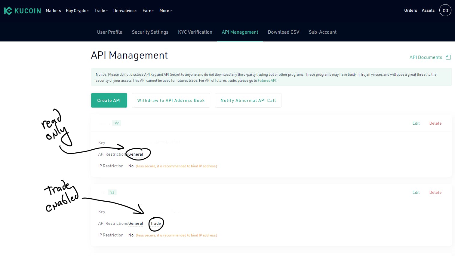 Afterwards, you should have two keys, a read-only key and a trade-enabled key: