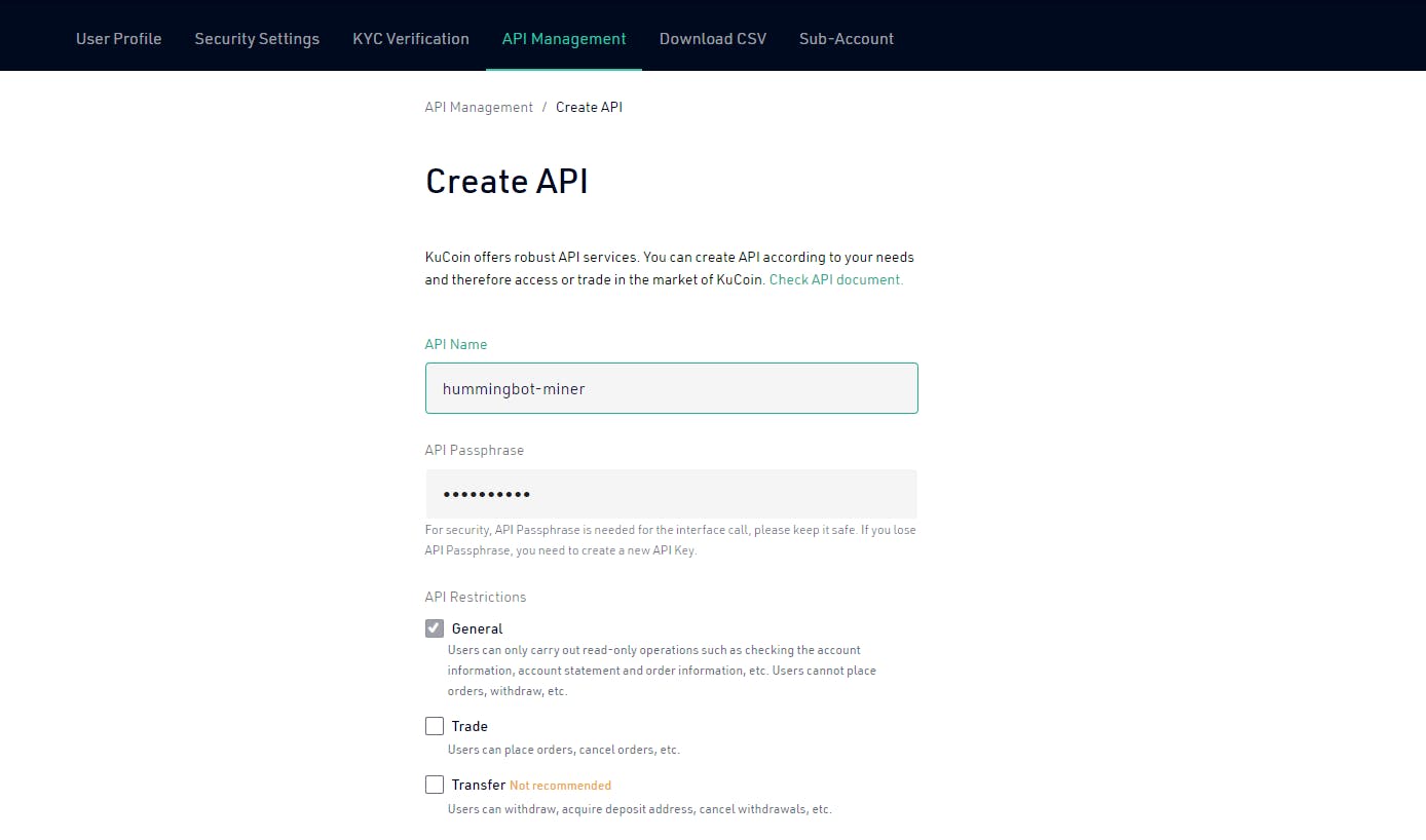 1.4 In KuCoin, you can create a read-only API by only checking the General option and leaving Trade unchecked: