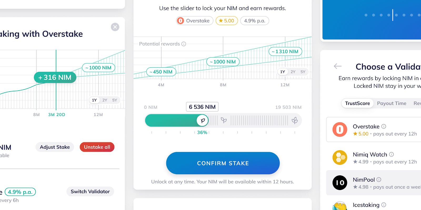 The core team has now arrived at and is working on putting the key building blocks together. As of now we are testing and debugging the node implementation with all components necessary to run the Testnet. In a setup like this, issues often become apparent only after the previous issue has been solved, which unfortunately makes it hard to parallelize the coding work beyond a practical point. The issues in the code are oftentimes small, but difficult to reproduce and even more difficult to find. Other parts of the core team are currently improving various aspects of the blockchain: The Nano Sync is making good progress, staking-related transactions are being improved and work is being done on the network layer. At the same time our designers have been busy creating shiny new user interfaces for the staking feature of Nimiq 2.0. There will be further fine-tuning and iterations on the designs and they look very promising already.