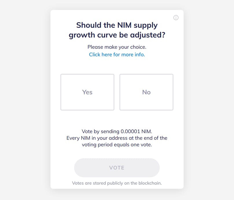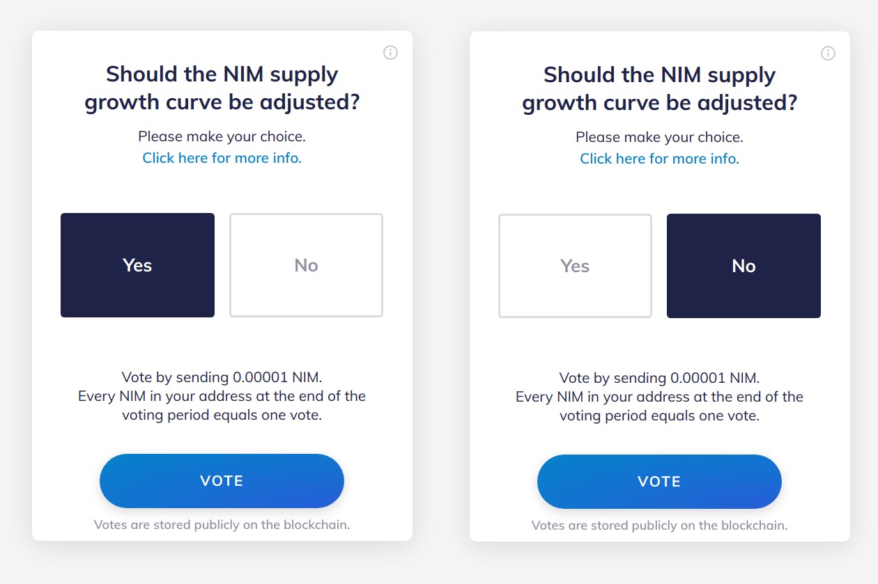 Try out our Testnet Vote which will run until Wednesday May 6. The important first vote on Mainnet will begin on Friday May 8 approximately at 12:00 noon UTC. UPDATE: The important first vote on Mainnet has been concluded and resulted with 78.4% in favor of making an adjustment to the NIM supply curve. The second vote on ranking NIM supply curve options will begin on Friday May 29 at approximately 12:00 noon UTC (https://nimiq.com/vote#rank-curves). Try the Testnet Ranking Vote from Saturday May 23 to Tuesday May 26. Nimiq will share all official information and results on its Twitter account so make sure to stay tuned.