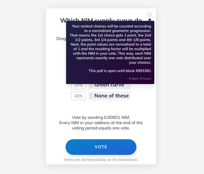 Second Vote (https://nimiq.com/vote#rank-curves): Given that the first decision resulted in favor of a supply curve adjustment, stakeholders can vote by ranking four options: “Green Curve”, “Red Curve”, “Blue Curve” or “None of these” (1st choice = 1pt, 2nd = 1/2pt, 3rd = 1/4pt, 4th = 1/8pt). This vote will be open for 10 days, starting on Friday May 29, 2020 at approximately 12:00 noon UTC and ending on Monday June 8 at approximately 12:00 noon UTC (the more exact time would be determined by a specific blockheight target published at the beginning of the vote). [UPDATE: Vote concluded on June 8, 2020 and the NIM supply curve for Nimiq 2.0 has been determined as the "BLUE" curve (community suggestion). See results here.]