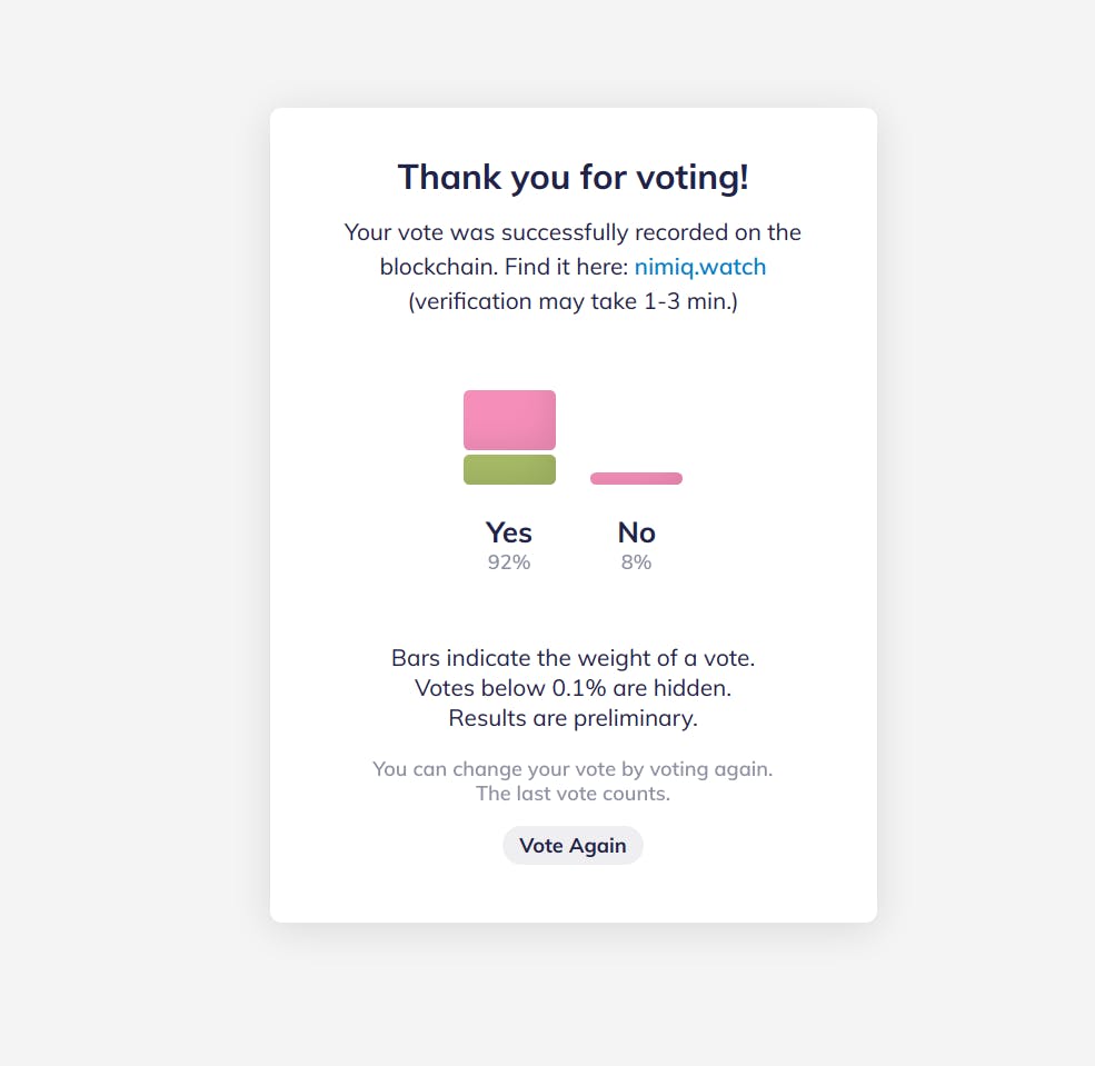 After your vote has been submitted, you will be able to see the preliminary results. Note that your vote will take a few minutes to be recorded on the blockchain and enter the calculations. You can still vote again if you change your mind. Also you can vote with every address that has a balance to maximize your vote (instead of moving all your NIM to a single address to vote from). Only the address balances at the end of the voting period count towards the vote. In other words, for your voting balance to count, do not move your funds before the end of the vote.