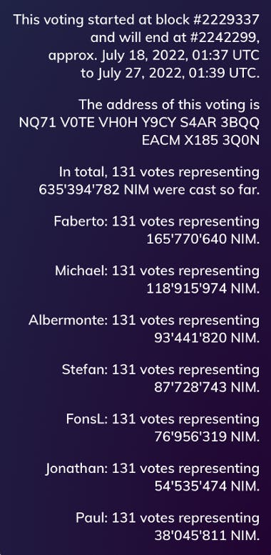 After being open for 9 days, we now have the results. In total, 131 community members participated, voting with 38 Million NIM! We know everybody is eager to find out who'll be representing the community over the next 6 months. So without further ado, here are the results: