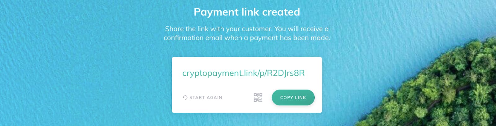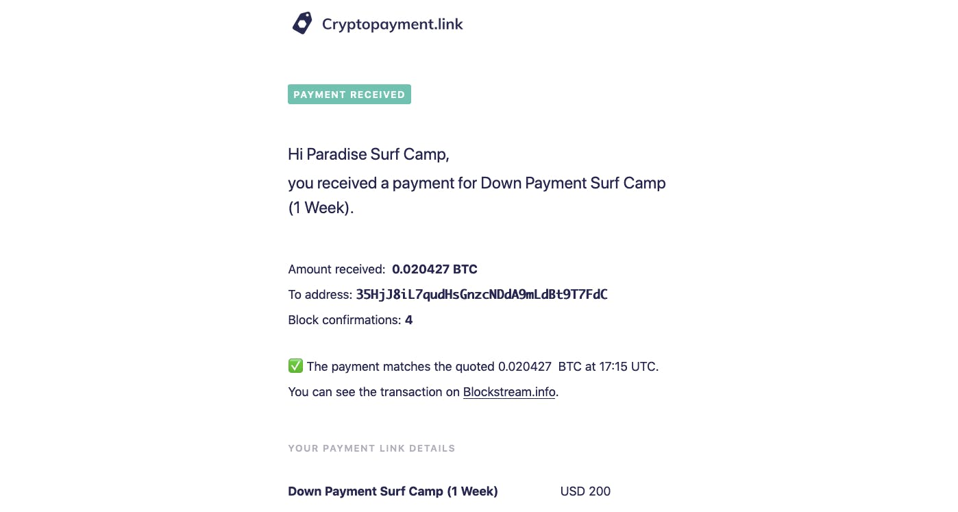 For starters, you’ll get a confirmation email telling you that your payment link has been successfully created. Once your client has paid your crypto payment link, you’ll then get a handy email notification telling you that you’ve been paid.