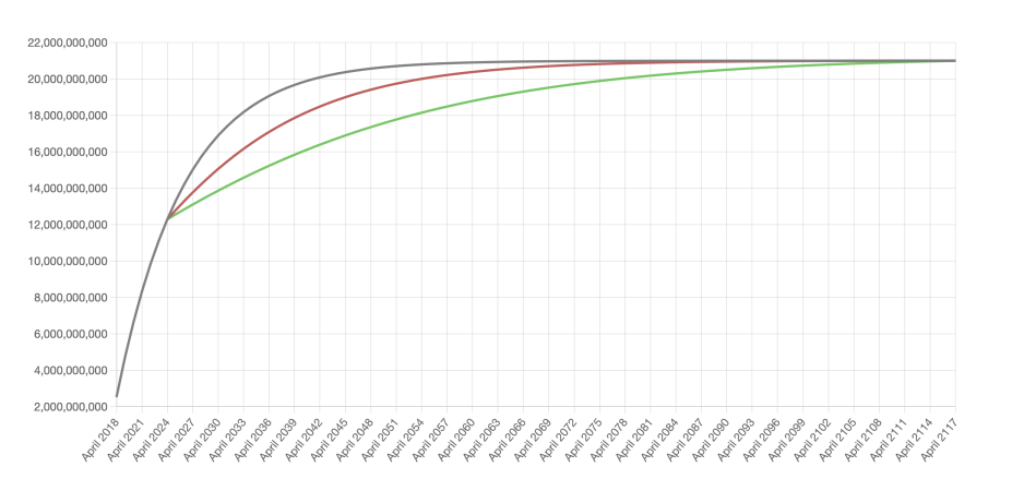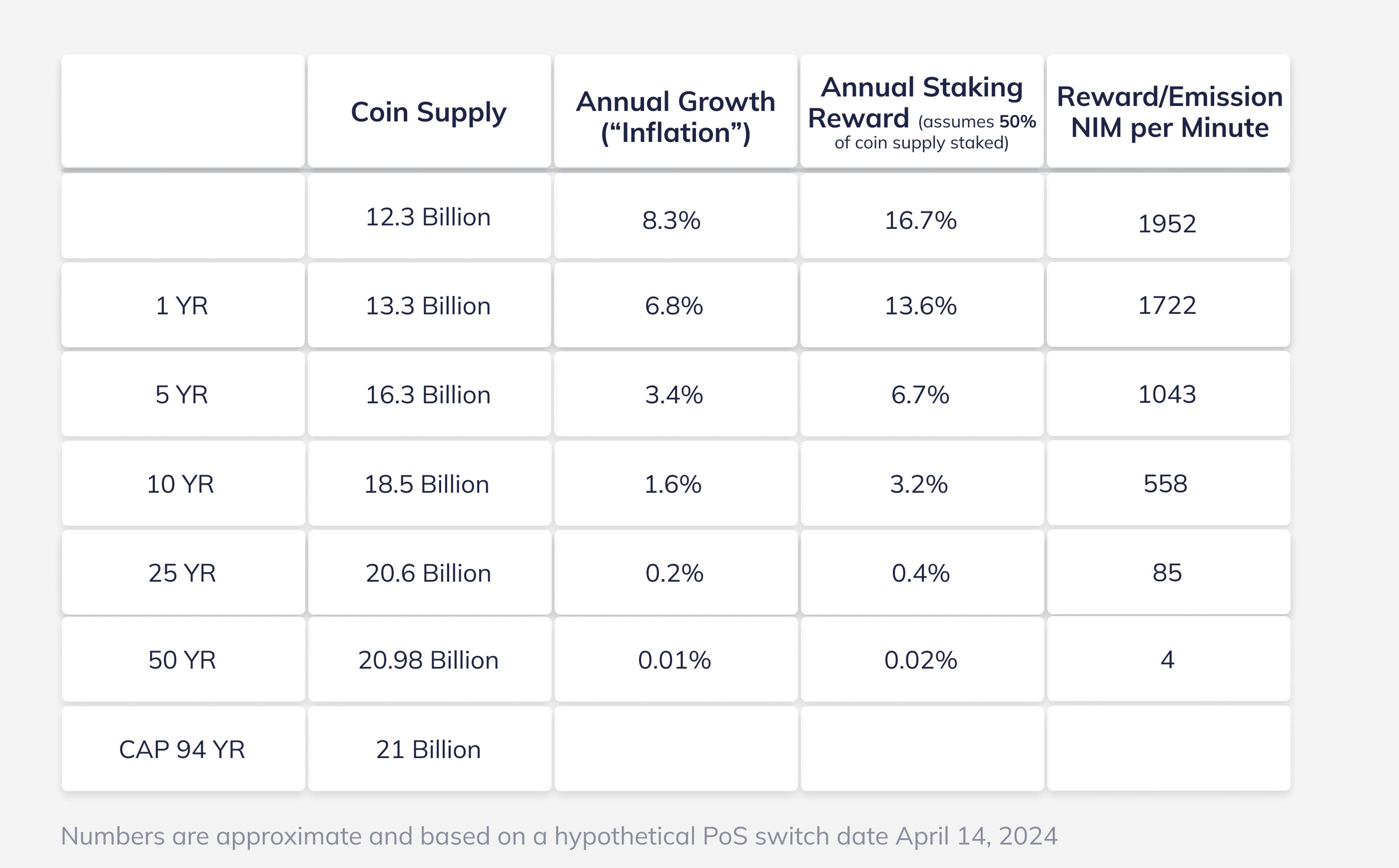 Option B. The Preservation of Initial Annual Supply Growth (RED Curve), as per the outcome of the emission curve vote from 2020: This approach aims to maintain the initial annual supply growth rate at 4.1%, which equates to an initial absolute emission of approximately 1000 NIM per minute. To adhere to the envisioned total supply target within the projected timeline, this would require an accelerated decrease in rewards, with the annual reduction rate heightened to about 6%.
