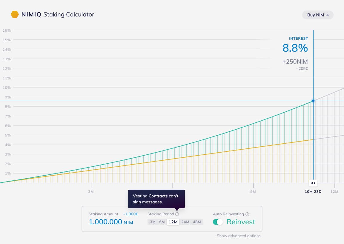 With the NIM supply curve for Nimiq 2.0 determined, Team Nimiq can finish implementing a staking calculator so current and potential new stakeholders can already do their own calculations and projections regarding upcoming staking. This also means Nimiq 2.0 can be picked up by popular staking reward listings on data driven Proof-of-Stake sites for visibility of Nimiq and comparison with existing staking coins.