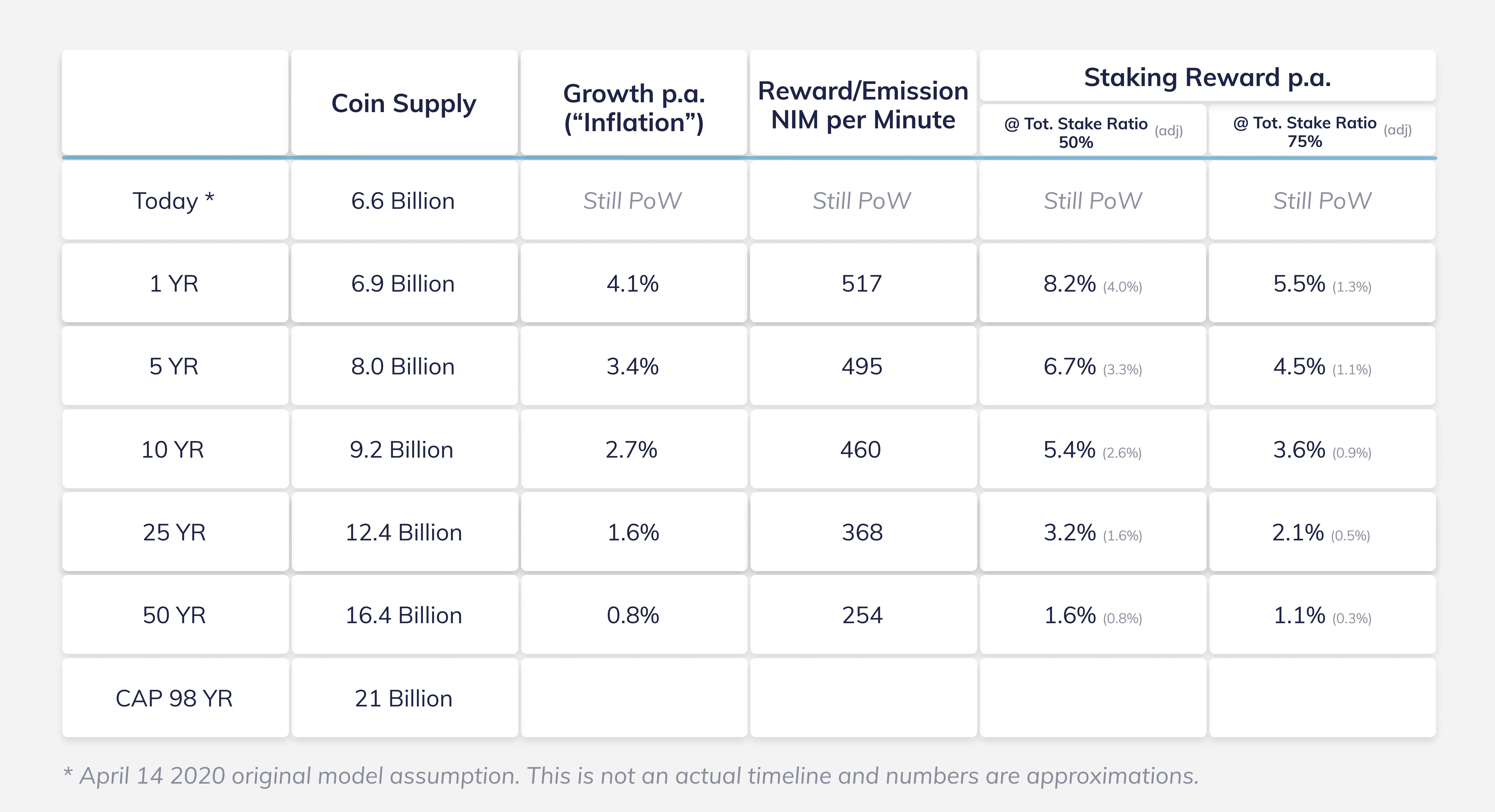 Depending on the actual timing of the switch to PoS and Nimiq 2.0, the first year NIM supply growth (inflation) will be around ~4.1% and the reward will average around ~517 NIM per minute. The initial stock-to-flow ratio then comes to ~24. The total NIM emission/reward decreases by 1.47% every year. If you want to look at numbers yourself, you can use this spreadsheet. Below is a table summarizing the timeline characteristics of the NIM supply curve for Nimiq 2.0.