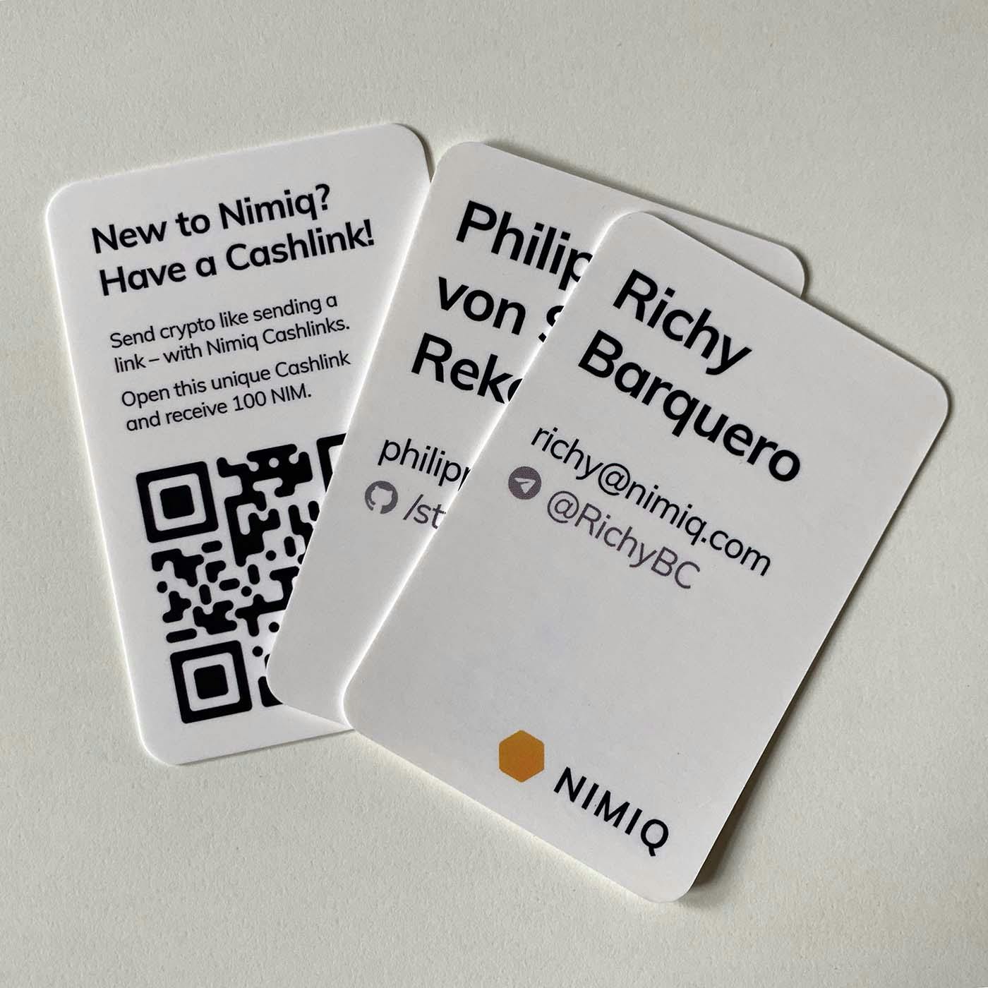To kick-start the usage of Cashlinks, Team Nimiq will be handing out some brand new engaging Cashlink business cards at the Web3Summit and CCC events in Berlin as well as the BDLT event in Vienna, where Nimiq Developers will be giving a talk and a workshop.