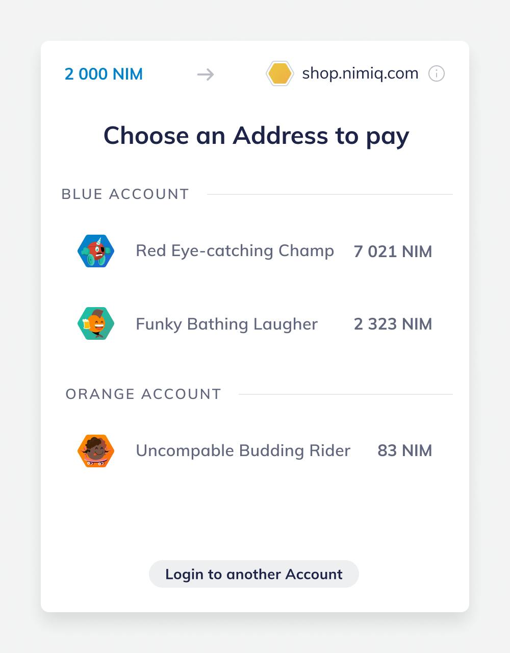 When shopping online with NIM, simply click pay, choose an address and confirm the transaction with your password.
