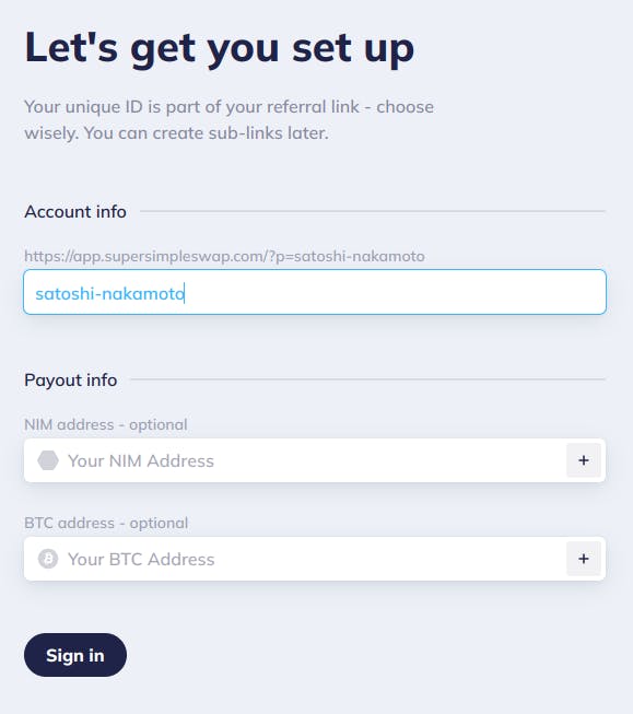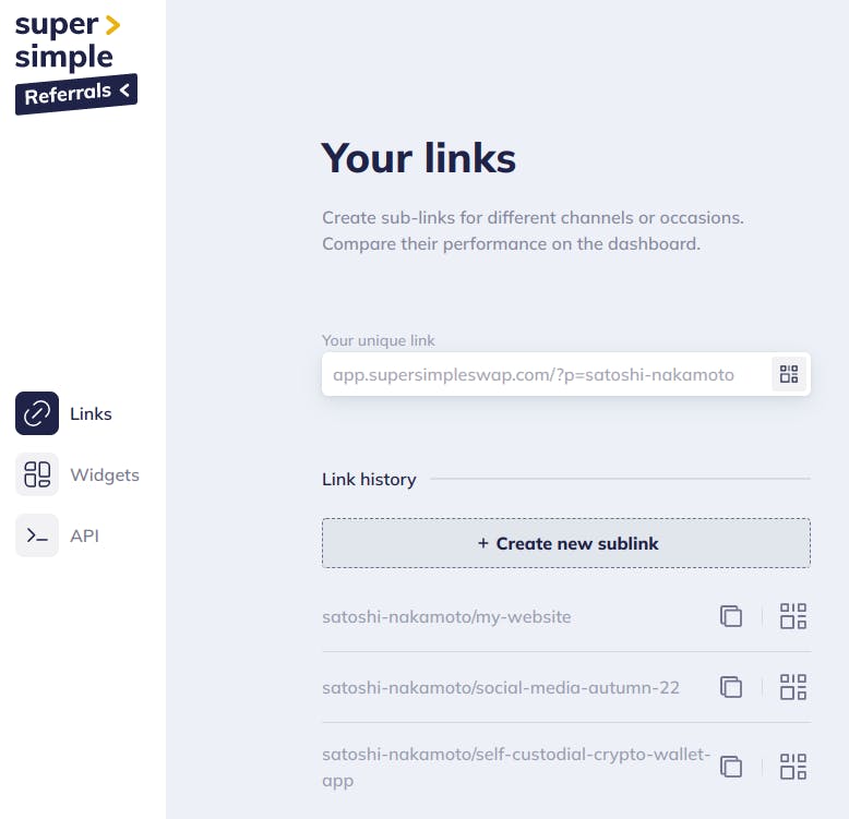 We want to spread the word and let everybody know that SuperSimpleSwap.com exists! And to do that we are now introducing referrals, a way to reward supporters that educate others about the advantages of using a true self-custodial swap service like SuperSimpleSwap. Now you can log in to the SuperSimpleSwap.com Referrals dashboard with your email, create referral links and earn BTC or NIM from every swap that's made using your referral link. Every time someone clicks a referral link you've created and then buys or sells crypto using SuperSimpleSwap.com, you'll receive 0.25% of the amount. But wait…there's more! Our widget creator also lets you customize and integrate it into any app or website.