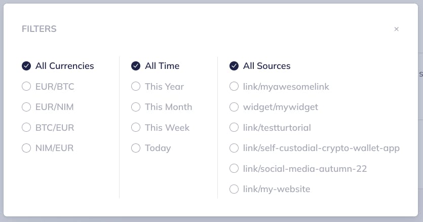 The dashboard also lets you filter the data based on timeframe, currency and link/widget used. This will come in handy for users that have large swap volumes and wish to define which links are working better and under which conditions.