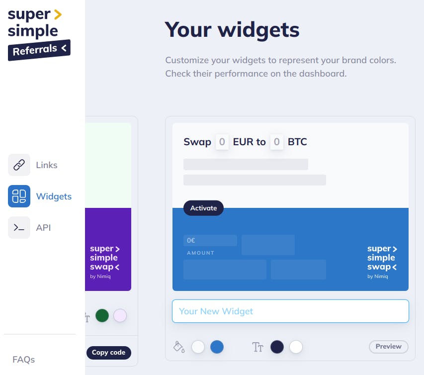 You would think this area of the app would be complicated – but we've managed to make it super simple. You basically create a widget by clicking “Add New”, give it a name, and customize the colors. By customizing it you can embed SuperSimpleSwap.com in your app or website while staying on brand. The last step is to simply copy the HTML code and move it to your site or application.