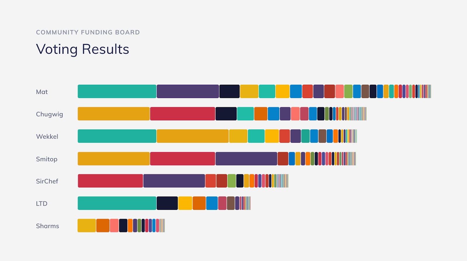 The voting process was held using a web application that records all votes on the Nimiq Blockchain. The voting app was built by Community Representative Chugwig and is hosted by both Chugwig and Smitop. This adds a new usecase to the Nimiq Blockchain by resulting in an easy-to-use voting platform with a high level of transparency and decentralization since all votes are public, not controlled by any single individual/entity and will be stored in the Nimiq Blockchain for posterity. Here is a summary of the final results: