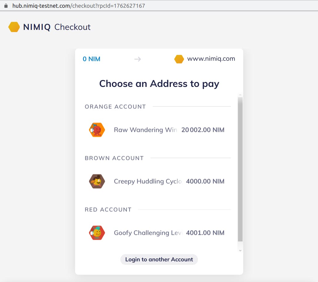 By clicking the VOTE button, the familiar Nimiq Checkout dialog will appear. If you have multiple addresses, you will be asked to select one.