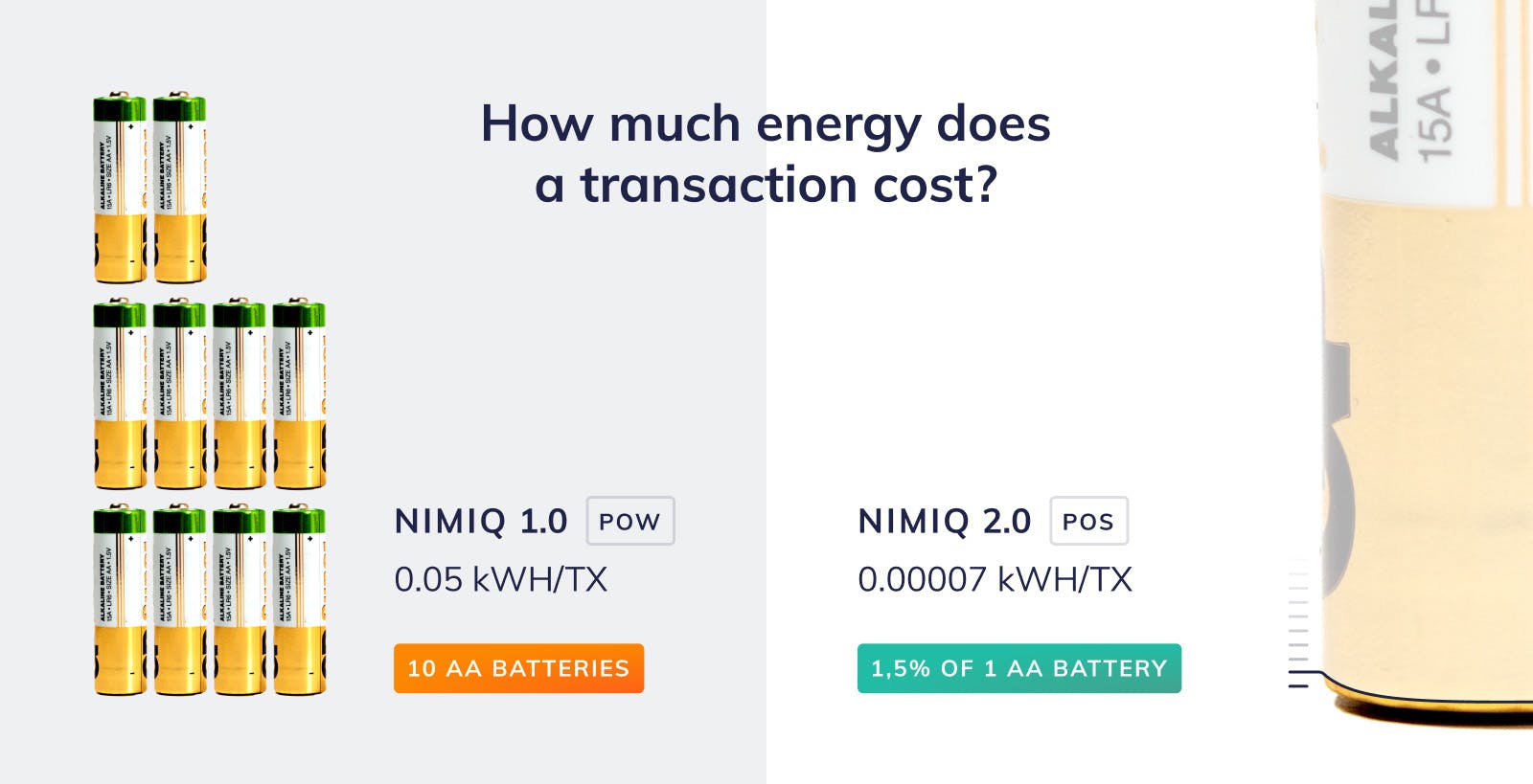 The significance can be illustrated by our projection of energy consumption per transaction. Currently, a transaction at full network capacity requires the equivalent energy of ten AA batteries. With Albatross, it’s 1.5% of one AA battery.
