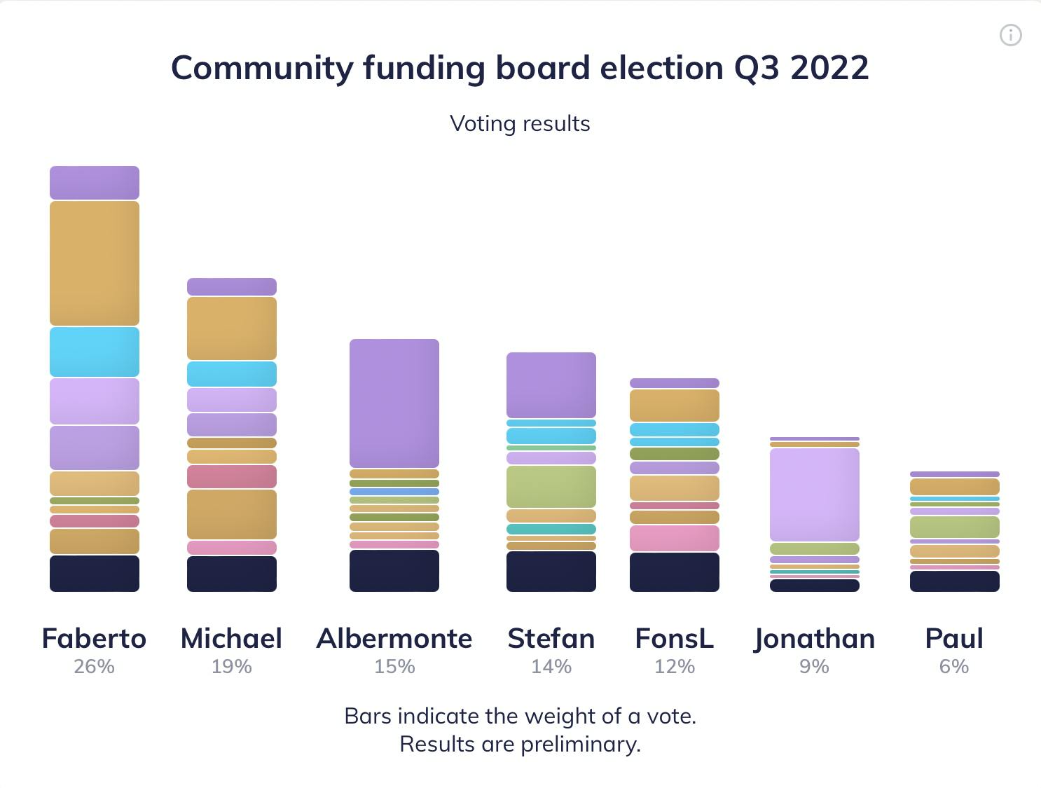 Since every vote was signed with a Nimiq transaction, results are recorded immutably in the Nimiq Blockchain. A snapshot was taken at the end of the election. Ranked choices of votes were counted according to a normalized geometric progression. That means the 1st choice of every vote got 1 point per NIM, the 2nd ½ point, 3rd ¼ point per NIM and so on. You can see the results for yourself in the Nimiq Voting app