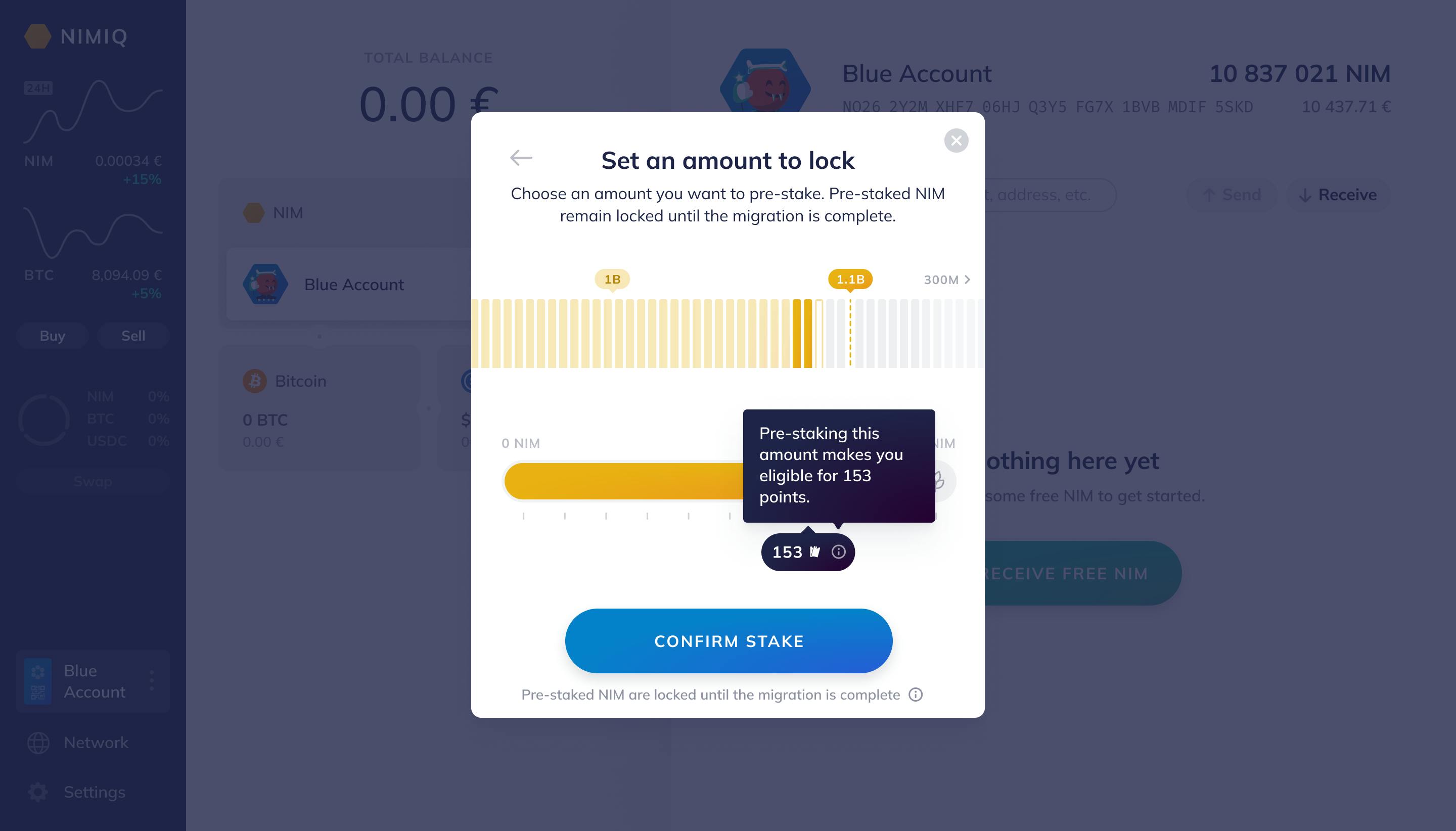 Decide how much NIM you want to pre-stake. And confirm stake.