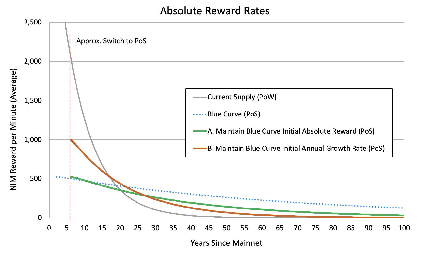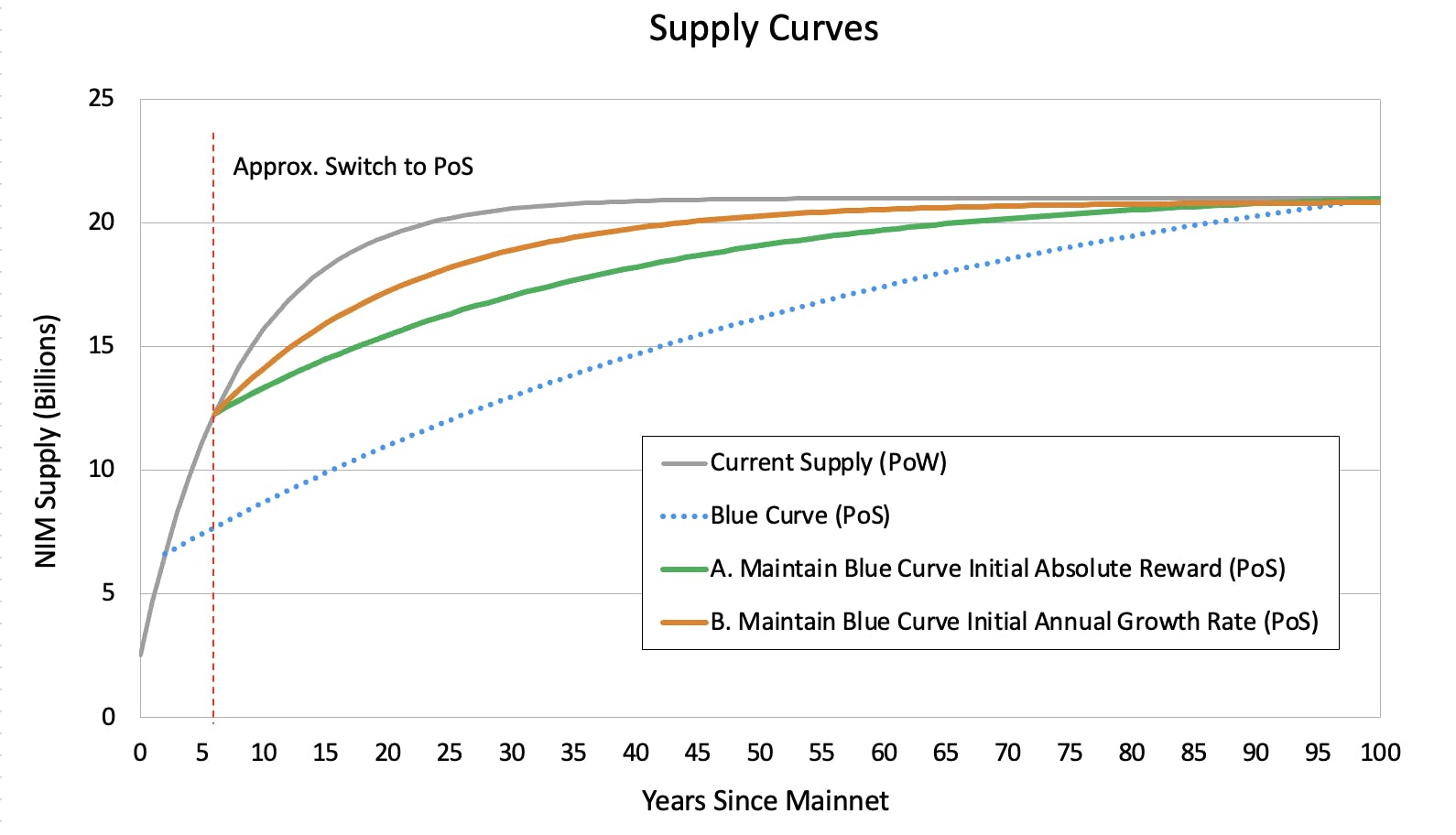 The Proof-of-Work emission to date has pushed the NIM supply to a level where the community-chosen curve for Proof-of-Stake emission requires adjustment. In simple terms, going with the elected curve would lead to reaching the original target of a 21 billion NIM total supply much sooner than anticipated.
