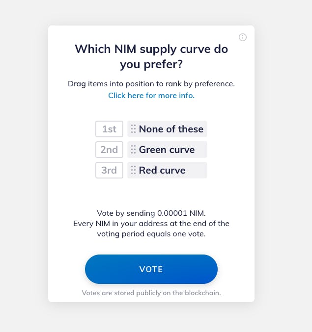 Starting on Thursday March 28, 2024, every stakeholder of the Nimiq community will have the opportunity to participate in a vote on three curve options for the PoS supply curve adjustment (plus the choice to not go with any of these options). The voting process will remain open until the end of Saturday April 13 UTC (block #3141223), and will be facilitated through the use of Nimiq wallets. NIM holders will be able to cast their votes in a transparent and verifiable manner on the Nimiq Blockchain by visiting the voting website.