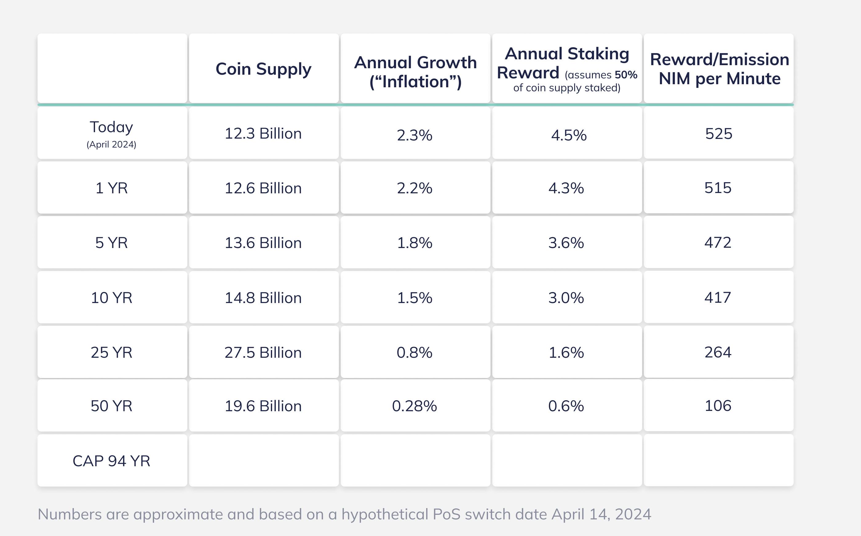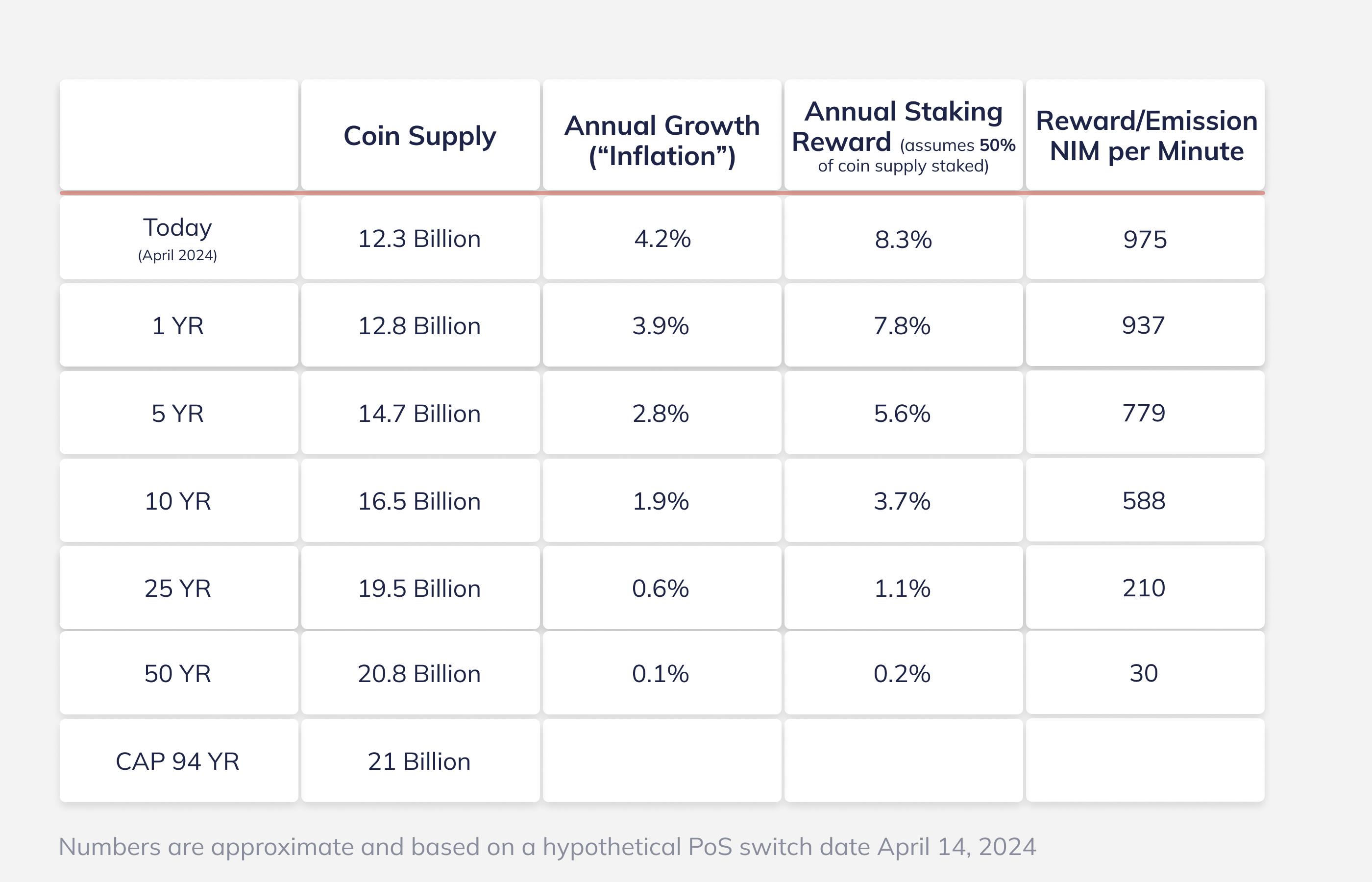 Option B. The Preservation of Initial Annual Supply Growth (RED Curve), as per the outcome of the emission curve vote from 2020: This approach aims to maintain the initial annual supply growth rate at 4.1%, which equates to an initial absolute emission of approximately 1000 NIM per minute. To adhere to the envisioned total supply target within the projected timeline, this would require an accelerated decrease in rewards, with the annual reduction rate heightened to about 6%.