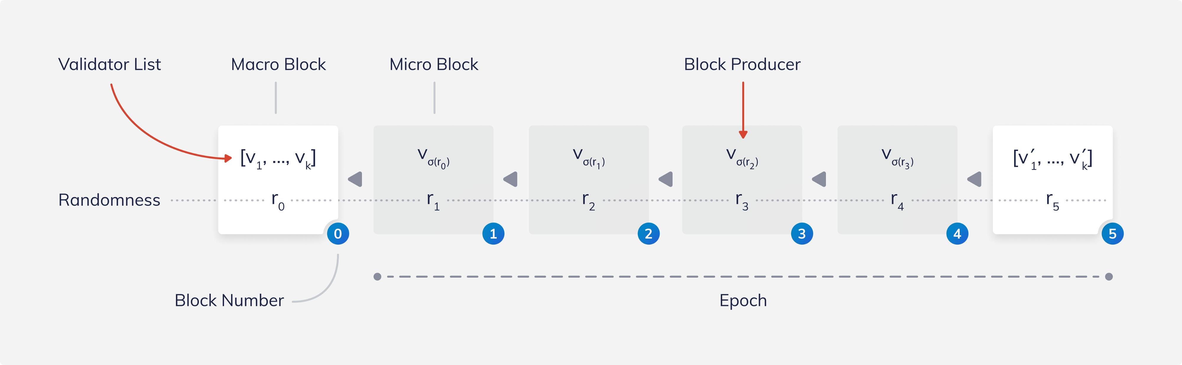 To be able to randomly choose the next block producer from the list of validators, each block contains a random beacon, depicted above by r_i. The block producer of a block uses a so-called Verifiable Random Function (VRF) to produce the next random value r_i from the previous value r_{i-1}. Every other participant can then verify the correctness of the next random value.