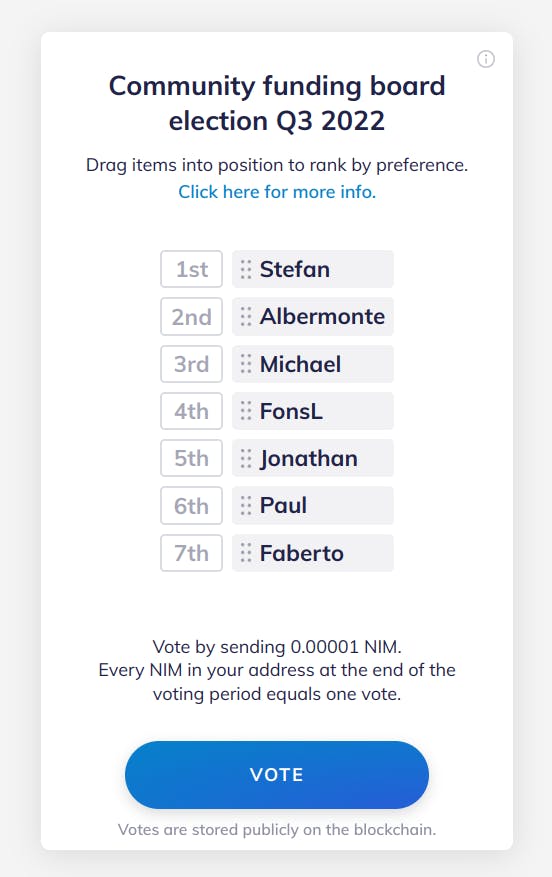 We're inviting you, as a valued member of the Nimiq community, to vote for a community representative in our Community Funding Board elections. Elections are open as of today and will close Tuesday 26th. This is a great opportunity to get your voice heard and to help shape the future of our community's ecosystem!