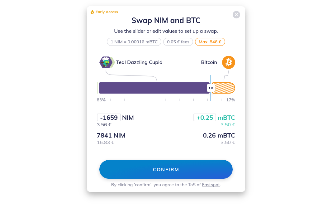 To set up a swap, you can either move the slider to set a new ratio between your NIM and BTC holdings, or specify an amount in the input fields. You'll then get a quote from Fastspot that is calculated on the spot. The swap fees are displayed at the top — just hover your mouse over the fees (tap on mobile) — and you’ll get more details on the fee composition.