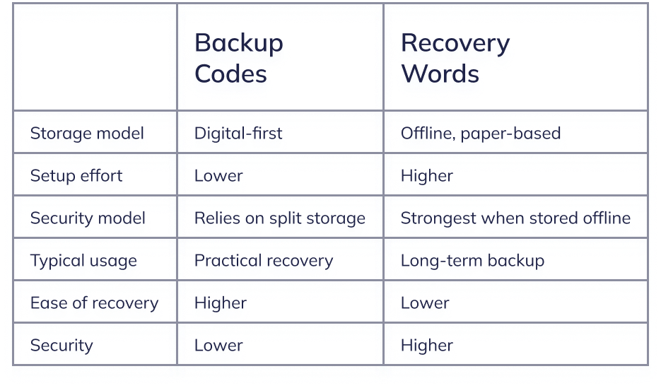 The Nimiq Backup Codes don't replace Login Files or Recovery Words. They exist to address a common pain point: losing access to a wallet when a Login File is lost or a password is forgotten and the user never wrote down their Recovery Words. They are designed to recover the entire account, and not just to access the wallet. Our goal is to make self-custody management of crypto and its keys smooth and worry-free for users.