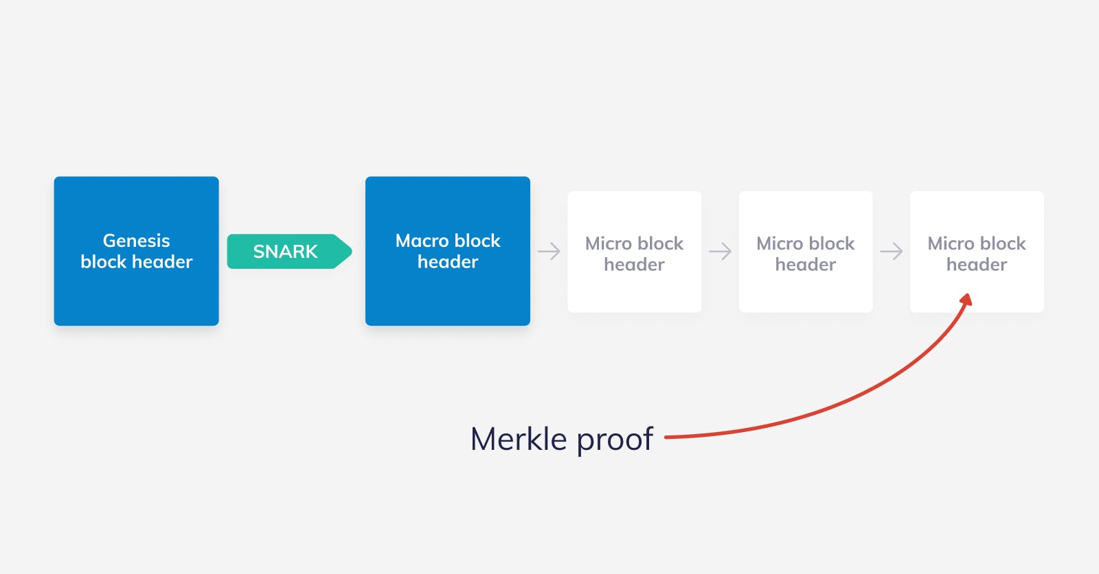 That leads us to nano nodes. While light nodes need to download all of the macro block headers, nano nodes only ask for the most recent one and a SNARK attesting to the fact that there is a valid chain of macro block headers that start with the genesis block and end in the most recent block. Note, we can assume that it has the genesis macro block header already as it is public knowledge. The SNARK is enough for the node to be convinced that the macro block header that it received is valid. After that, it just needs to download the headers of the micro blocks in the current epoch plus whatever Merkle proofs it needs.